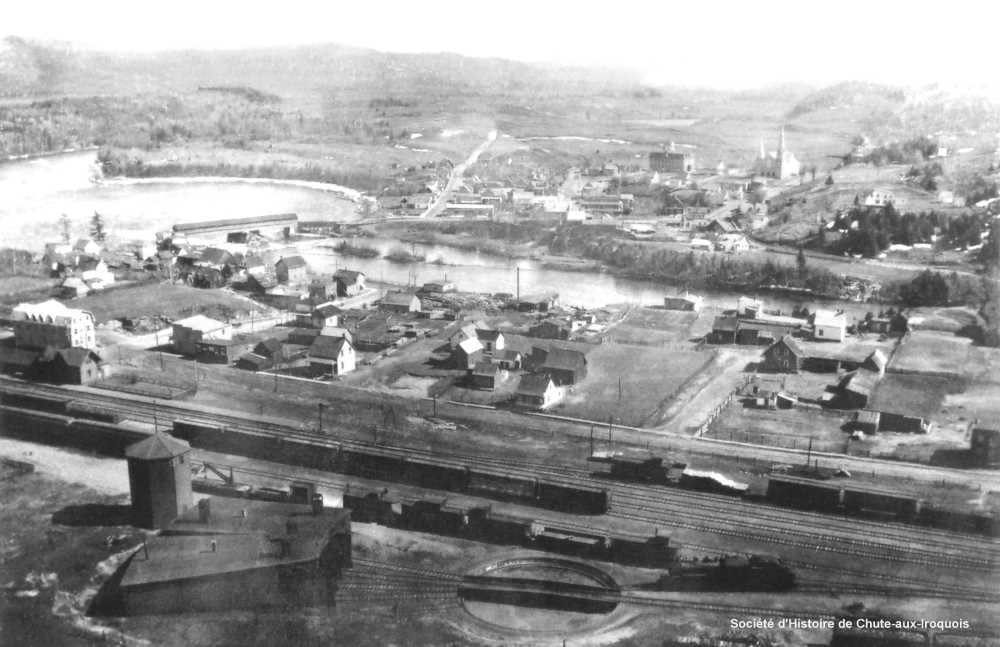 À l’arrière de la gare, l’hôtel Larocque et plus loin, le pont couvert. Tout au fond, se dressent l’église et le couvent.