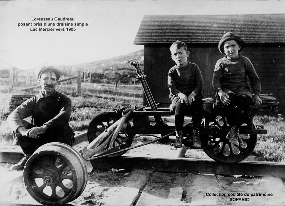 D’abord, photographiée vers 1905 à Lac Mercier, une draisine simple près de laquelle est assis Lorenzeau Gaudreau, contremaître de section et ingénieur de chemin de fer. (Coll. : Bréard)