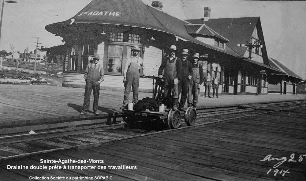 Puis une draisine double, prête à transporter des travailleurs pour une inspection dans la région de Sainte-Agathe-des-Monts le 25 août 1914.