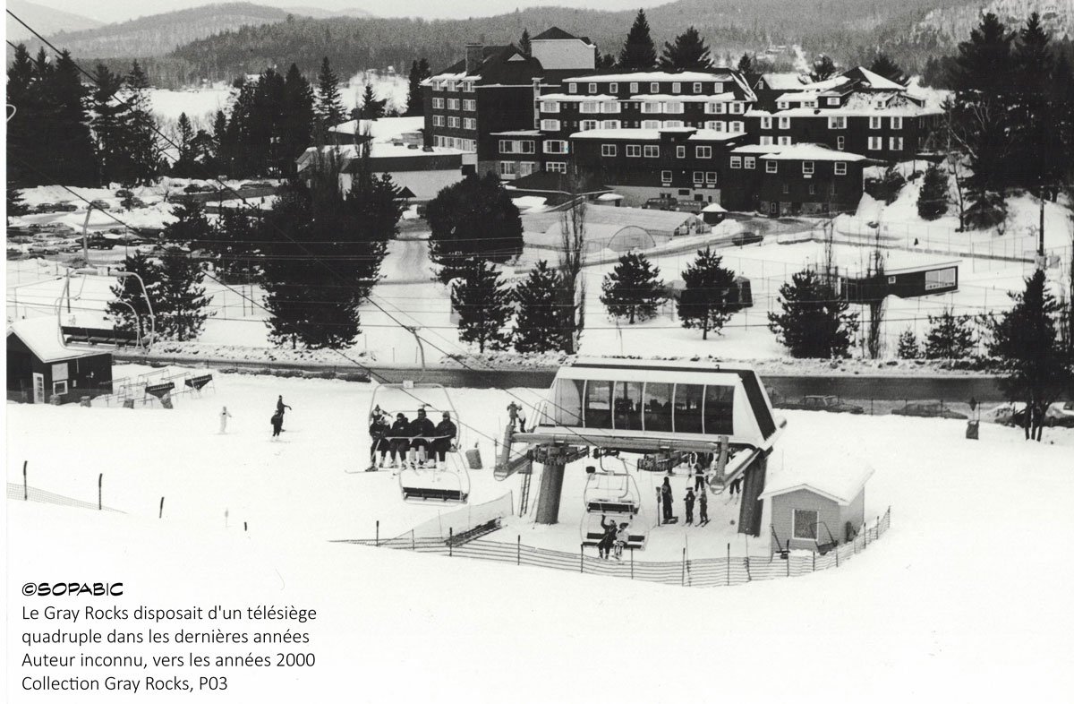Déjà en 1950, un premier télésiège est installé, c’est la plus récente innovation dans le domaine. Suivent, échelonné dans le temps, l’ajout d’autres remonte-pentes, l’expansion du domaine skiable et l’installation des fameux canons à neige. Cette invention technologique apparaît sur la montagne pour la première fois en 1963, elle assurera un enneigement adéquat de novembre à avril! En 1969, sont installés un autre T-Bar et les chaises brunes. En 1973, l’ouverture du versant ouest desservi par les chaises vertes est réalisée. Trois ans plus tard, le versant est et les chaises orange font leur apparition. La disparition des derniers T-Bar et du chalet « The Snow Eagle’s Nest », la construction du chalet Lucile Wheeler, l’installation du télésiège quadruple, l’aménagement du « tapis » pour les débutants et de leur parc réservé et les parcs pour planches à neige marquent les dernières décennies de l’exploitation de la station de ski Gray Rocks.